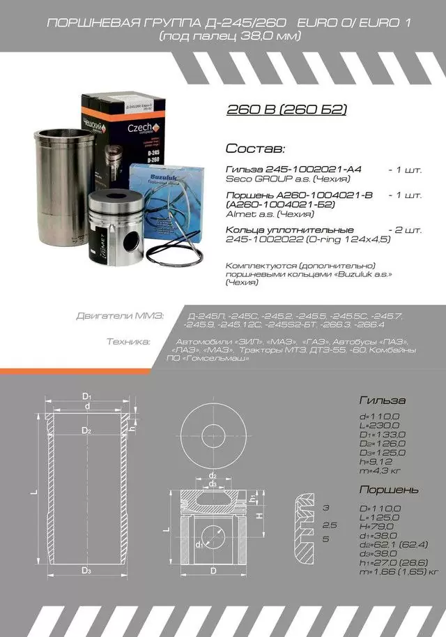 Поршневая группа Д-260/245, Евро 0 (палец 38 мм), Комплект 260 Б2 Ch